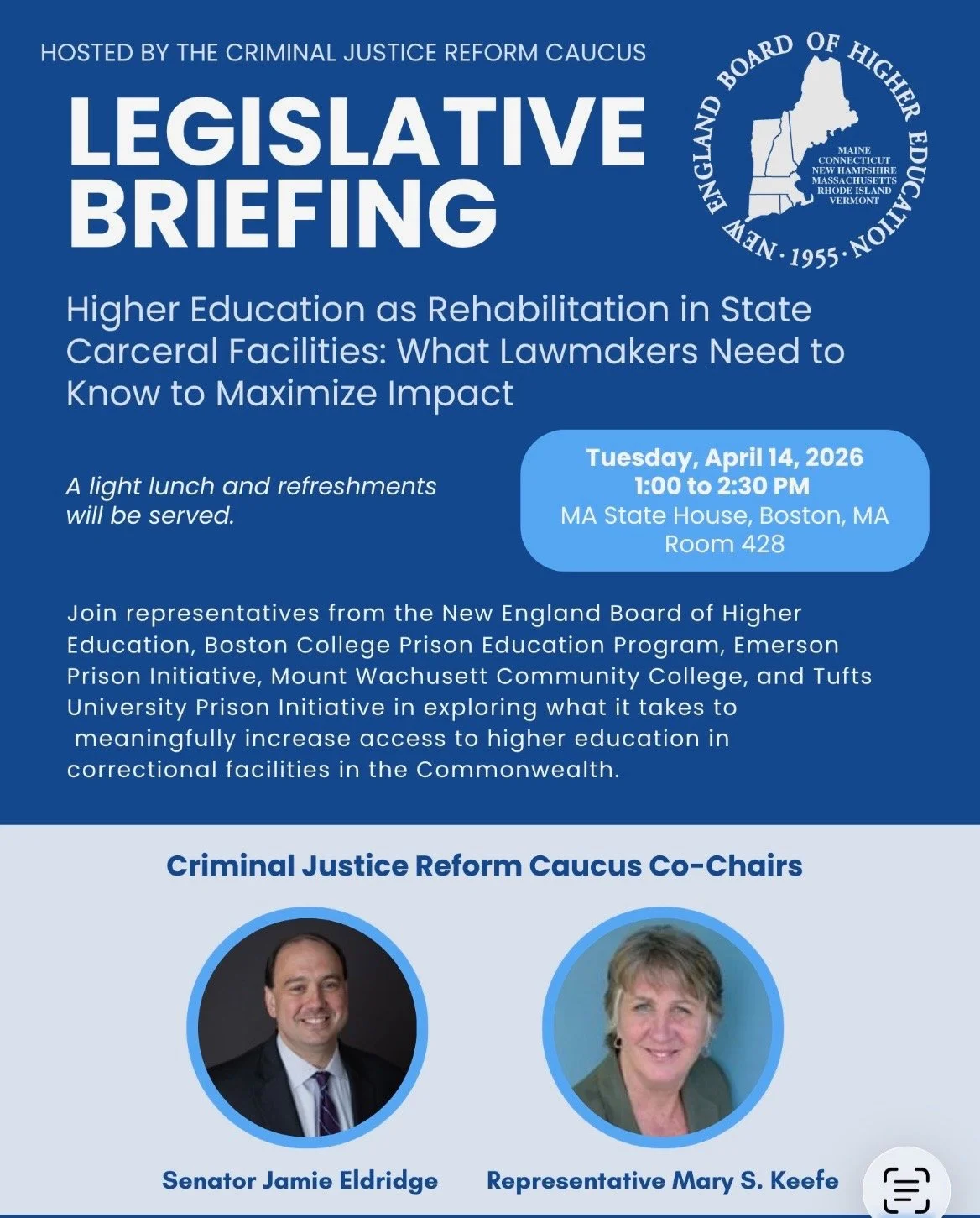 April 14, 2026. Higher Education as Rehabilitation in State Carceral Facilities: What Lawmakers Need to Know to Maximize Impact, Legislative Briefing, MA State House, Boston, MA, Room 428. Hosted by the Criminal Justice Reform Caucus.