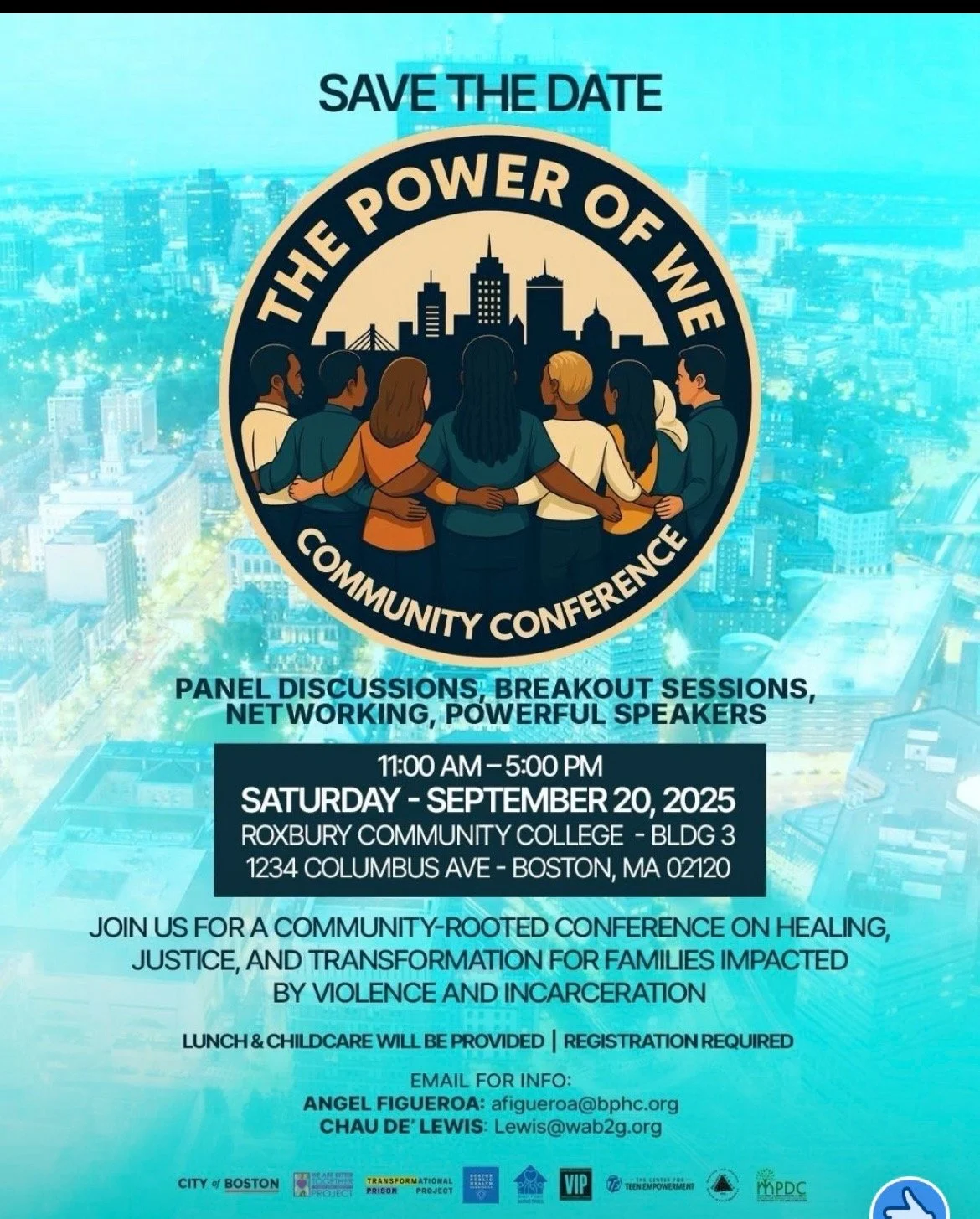 September 20, 2025. The Power of We: Community Conference, Roxbury Community College, Bldg 3, 1234 Columbus Avenue, Boston, MA. Through speakers, panel discussions, breakout sessions, and networking, this conference focuses on healing, justice, and transformation for families impacted by violence and incarceration.