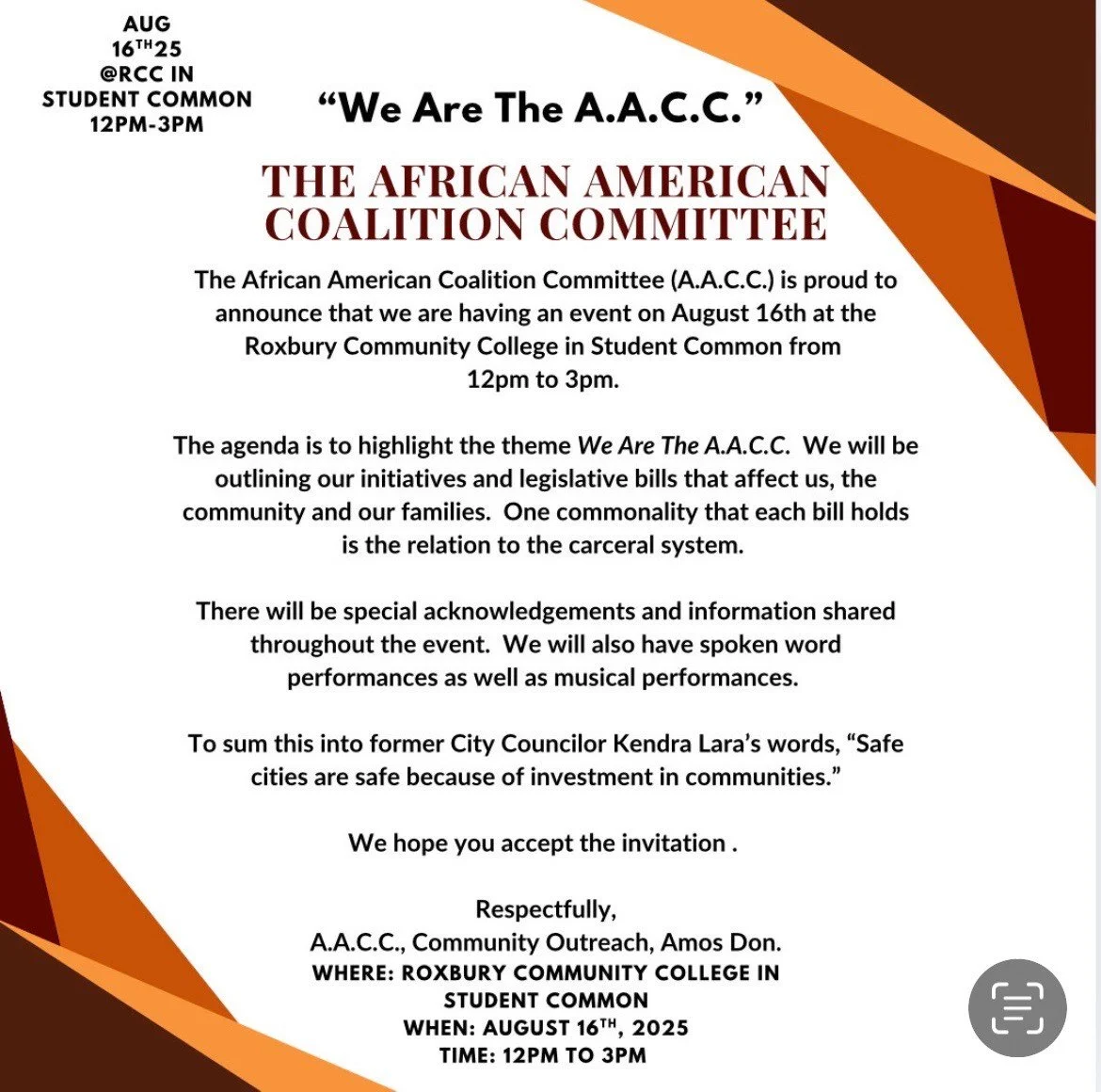 August 16, 2025. African American Coalition Committee’s (AACC) will present their work, discuss the joint venture theory, and give individuals, advocates, legislators, and organizations an opportunity to build community, Roxbury Community College. AACC was founded in 1972 and is fully operated by the incarcerated men of NCI Norfolk. For more information, see the Harriet Tubman Project.