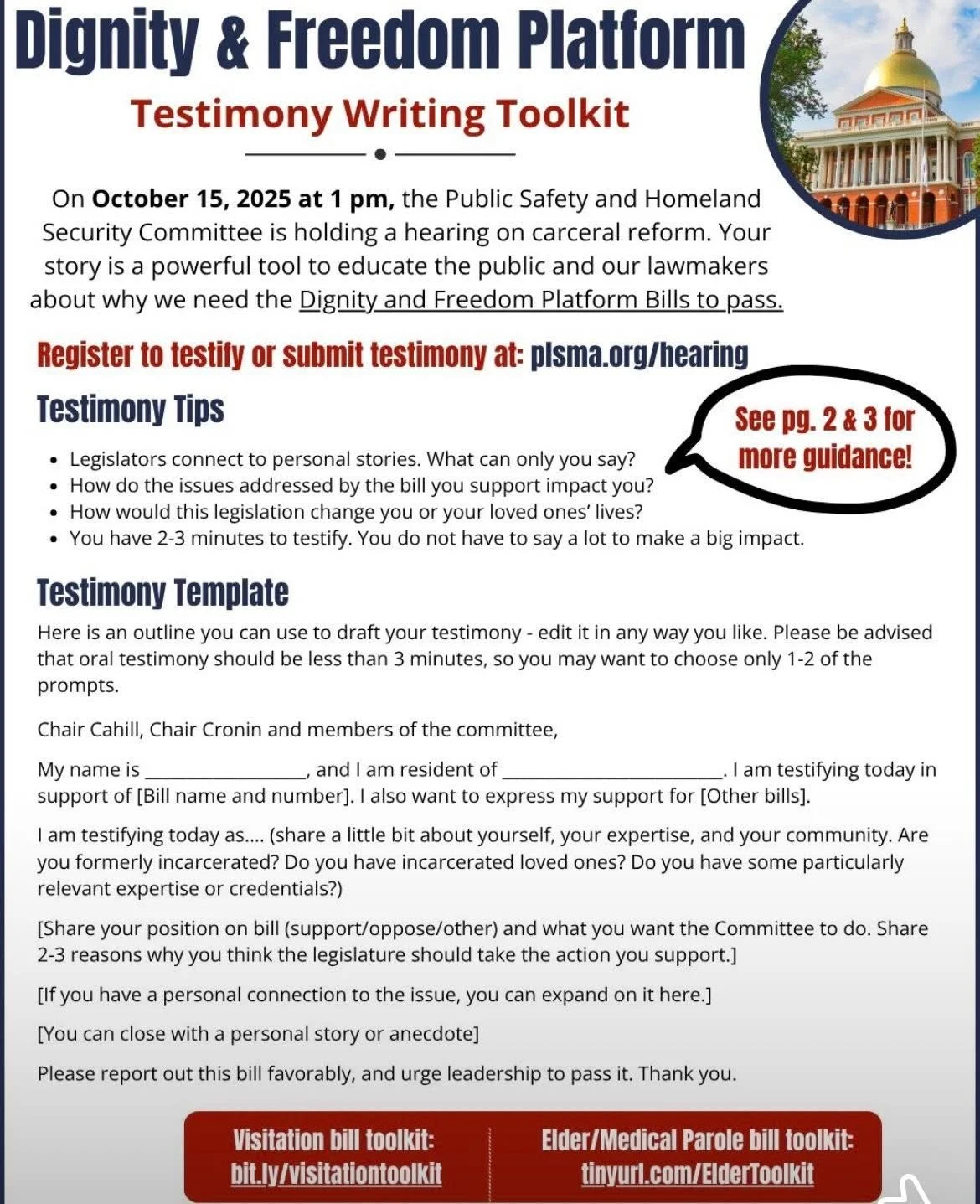 October 15, 2025. The Joint Committee on Public Safety and Homeland Security is holding a hearing at 1:00 pm, Massachusetts State House, Room A2 and virtual, regarding a number of important bills, including PLS’ Dignity and Freedom Campaign Platform Bills: